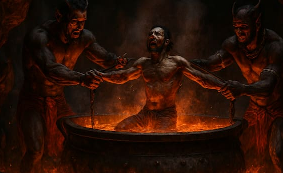 According to the Garuda Purana, a person who harms another for his own benefit is sent to the Kumbhipakam hell, where he is burned in a large pot of boiling oil.