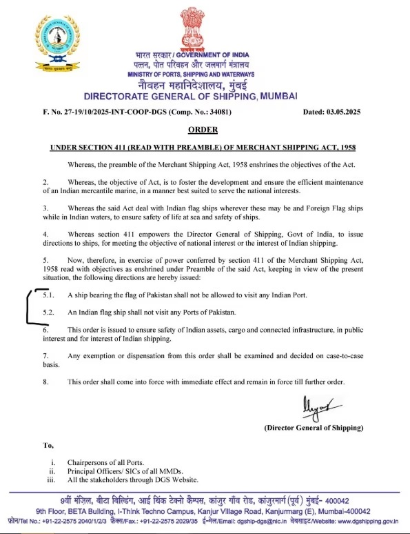 The Government of India has taken this drastic decision in exercise of its powers under Section 411 of the Merchant Shipping Act, 1958. This Act regulates commercial maritime activities in India. Section 411 empowers the government to prohibit the entry of any foreign vessel into Indian ports on grounds of national security, public interest or strategic importance. Under this legal provision, Pakistani ships have been stopped from entering Indian waters.