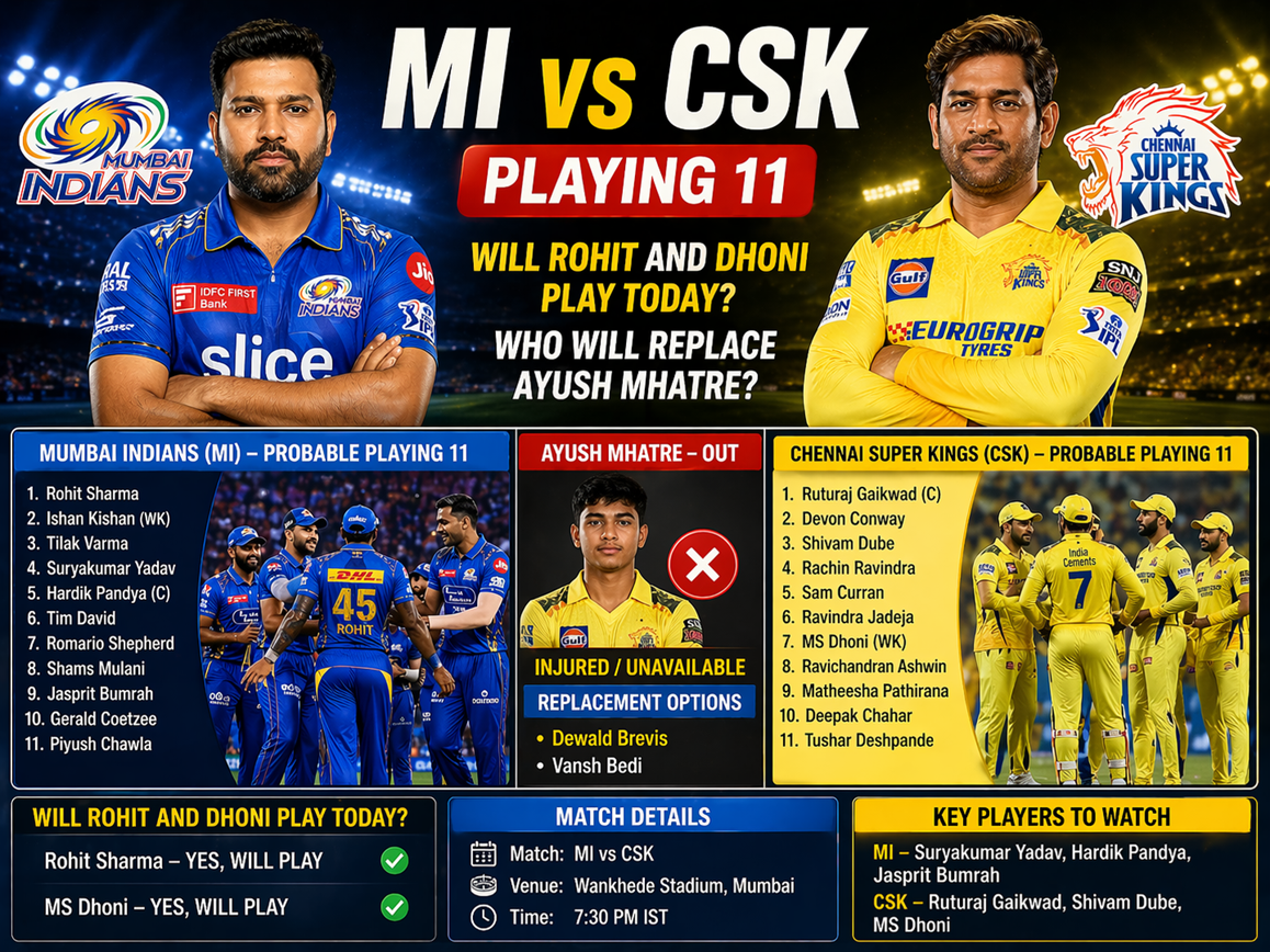 MI vs CSK Playing 11: Will Rohit and Dhoni play today? Who will replace Ayush Mhatre? See the probable playing 11s for Mumbai and Chennai.