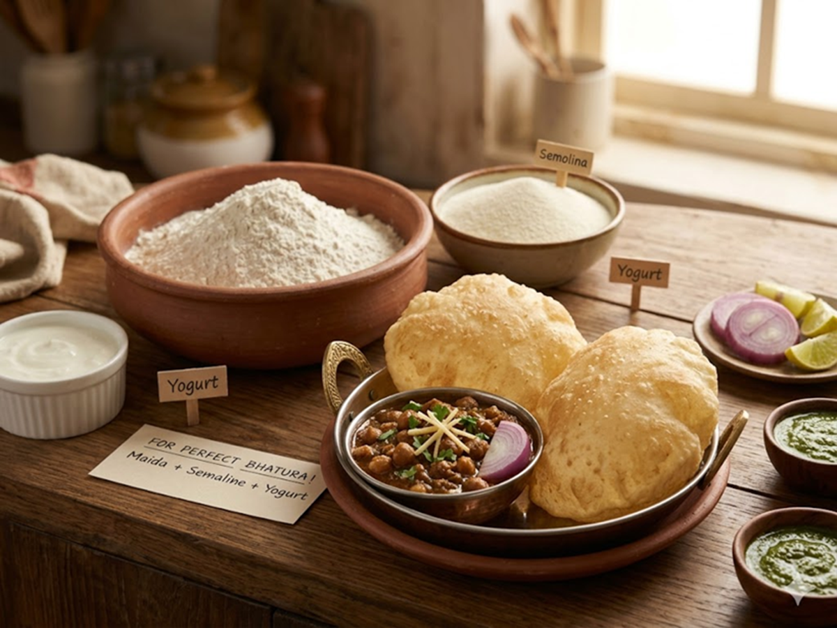 Flour is commonly used for bhatura, but using only flour often results in flat bhaturas. A little flour is considered beneficial for a better texture.