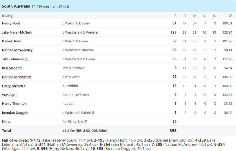 If we talk about the match played between Tasmania and South Australia in 'The Marsh Cup 2023', then in this match, the South Australia team won the toss and decided to bowl first. Batting first, Tasmania scored 435 runs for the loss of 9 wickets in 50 undefeated overs. Chasing the target of 436 runs, South Australia were all out for 398 runs in 46.4 overs and South Australia lost the match by 37 runs.